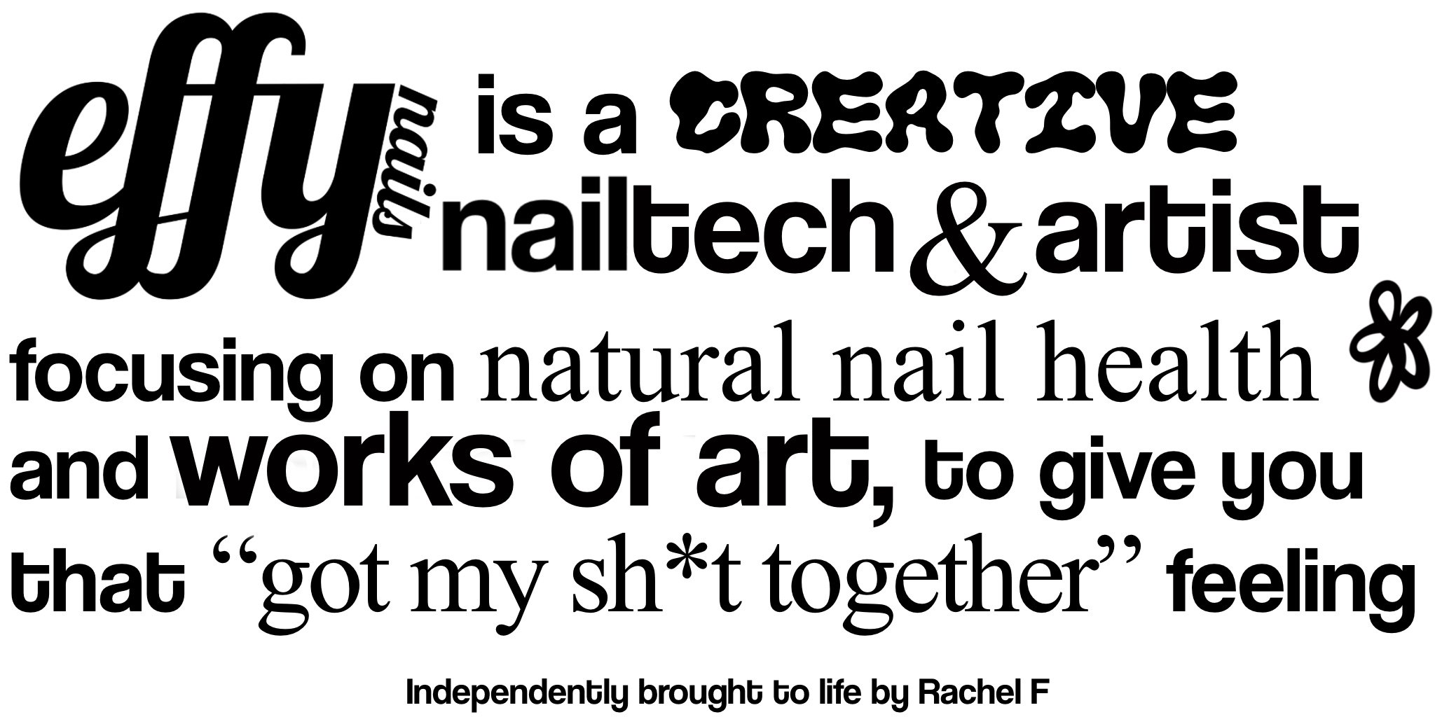 The artist and nail tech behind Effy Nails. A Libra with a touch of Caprisun for good measure. Flew to Berlin from Essex many moons ago, now finds herself collaborating and working with people from all around the world.